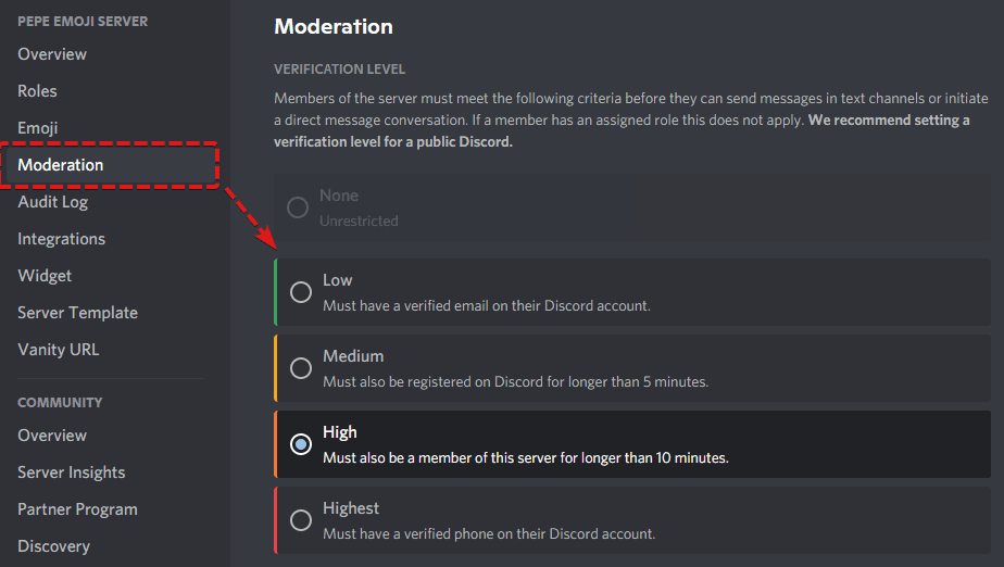 In order for this guide to be most effective, you should go into your server settings, go to the Moderation tab, and double-check which verification level you have selected.