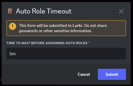 You can now add your On Join Roles to Lurkr. In the current version, it is not possible to assign different roles to different timeouts, they will all be assigned at the same time.