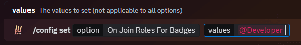 To get started, type the command below, with the role you want to assign to one badge as the values option as shown below.
