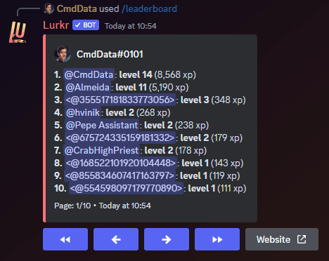 The embedded message will add ◀ and ▶ buttons, which when pressed by the command author allows you to turn to the next leaderboard page. A total of 10 users can be listed on the same page, and are shown what level they are and how much levels they have gained.